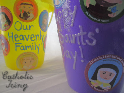 I started by writing messages on them with fabric paint. I wrote things like "Happy All Saints' Day", "Pray for Us", and "Our Heavenly Family". One bucket that has all pictures of Mary says "Queen of the Saints". I also thought about writing "When the Saints Go Marching In", but forgot to. I let the messages dry overnight.