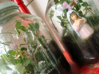 We are proudly displaying our mini Mary gardens on a shelf on our porch. We practically live on our porch this time of year! If you'd like to make something really classy for display, you can try making terrariums in apothecary jars.